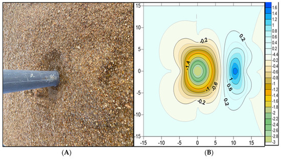 Scour hole characteristics around a pier in no−debris conditions: (A) scour hole configuration after water was drained out, and (B) contour map highlighting maximum scour and deposition depth. All numbers are in centimeters.