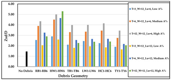Figure 6 summarizes the relative impact of the debris configurations. The vertical axis represents the ratio of maximum scour depth to the pier width (). Each group of vertical bars comes from a different debris shape. Each color corresponds to a specific immersion depth ( = 3, 6, and 12 cm) and distance upstream from the pier ( = 6 and 12 cm). The high wedge shapes and produced the deepest scour (( = 3.8 and 4.1, respectively). The high wedge shape also produced significant scour for all conditions (). The triangle yield () was the least impactful shape, which produced less scour.