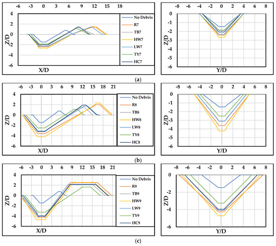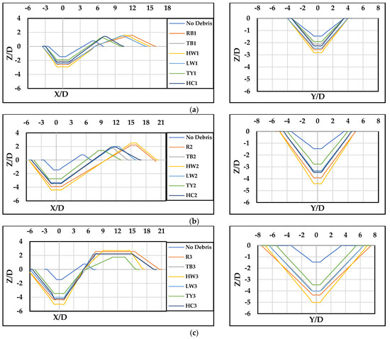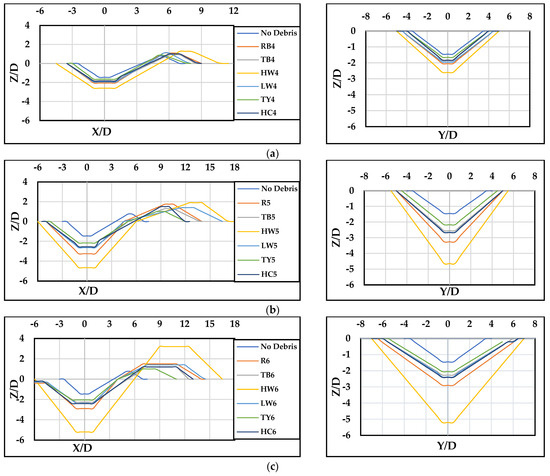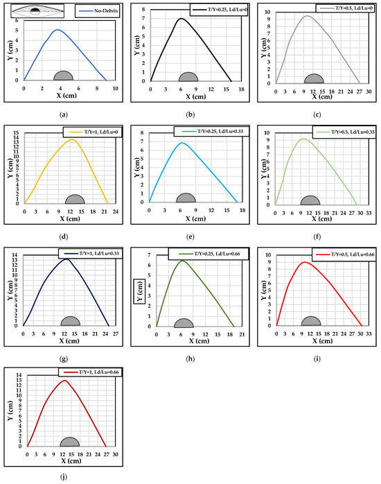 Schematic distribution of the scour hole and dimensions along the () axis for various scenarios: (a) no debris, (b) , (c) , (d) , (e) , (f) , (g) , (h) , (i) , and (j) .