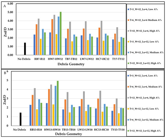 Figure 10 illustrates the relative scour depth results () for debris cases where / = 0.33, including variations in the downstream debris length and distance upstream from the pier ( = 6 and 12 cm). Debris accumulation obstruction percentages () ranged from 8.3% to 33.3%, and from 3.47% to 13.9% for the triangle yield () case only.
