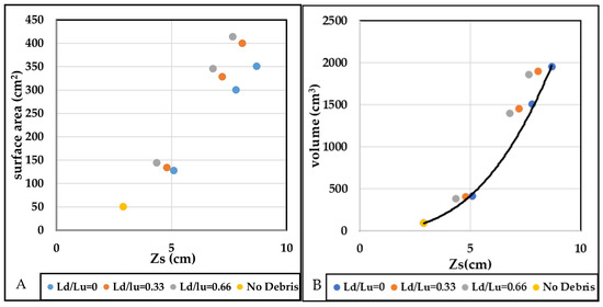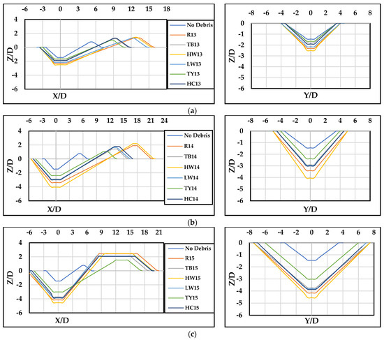 The dimensions of the pier scour hole directly correlate with the amount of eroded soil surrounding the pier structure. Figure 14 presents various scour map scenarios, including no−debris-induced and rectangular () debris-induced, with different scenarios and downstream debris extension ratios () of 0, 0.33, and 0.66 (, , and ). For these tests, the scouring area and volume development typically lagged in attaining the final scour depth. However, for simplification purposes, this study assumed both conditions occur simultaneously. Therefore, a one-sided scour hole area and volume were calculated. The expressions for a differential area or volume were integrated to determine the total area and total volume, as shown in the equations below: