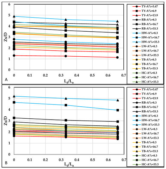 Figure 13A,B describe the influence of increasing the debris extension ratio (/) from 0 to 0.66 on scour depth () for various debris shapes and values when the debris upstream length was = 6 cm and 12 cm, respectively. Two figures were examined, both depicting on the -axis and / on the x-axis. both figures demonstrate a general decrease in with increasing / for all scenarios. The analysis suggested that a larger upstream debris length () might lead to a more significant reduction in scour depth for a given increase in /. The altered flow patterns brought about by the presence of debris can be responsible for the observed decrease in scour depth with increasing /. As / increased, there was a notable trend across all debris shapes: the scour depth decreased. This was particularly evident with shapes such as rectangular blocks () and , which created substantial obstruction to flow due to their solid and large surface areas, resulting in pronounced reductions in scour depth. Conversely, shapes resembling may allow water to bypass more easily due to their streamlined profiles, leading to comparatively less severe reductions in scour depth. Shapes such as or exhibited intermediate characteristics, with moderate reductions in scour depth due to their rounded or tapered shapes. Debris shapes resembling offered complex flow patterns, and the degree of obstruction and subsequent scour depth reduction could vary based on factors such as branch arrangement and angle.