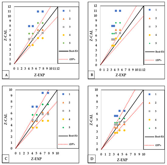 The comparative assessment involved contrasting the maximum experimental scour depth results () against the calculated scour depths derived from various methods [27,33,43,46,47] (), as depicted in two scenarios illustrated in Figure 16A–D. Additionally, each equation’s results and root mean square error () relative to the observed value were computed and summarized in Table 5.
