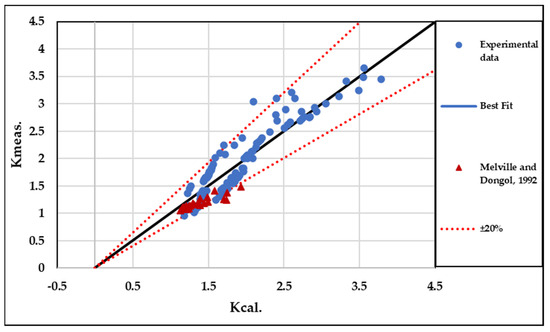 Equation (10) incorporates the debris shape factor (), obstruction ratio (), and geometric parameters, such as the downstream extension of debris relative to its upstream length () Equation (7), and the upstream length of floating debris relative to the pier diameter () Equation (6). These coefficients were derived from statistical analysis to optimize the equation’s predictive accuracy. The agreement between Figure 18 and the experimental dataset was deemed excellent, supported by a coefficient of determination () of 0.86 and a of 0.2, indicating strong correlation and minimal prediction error.