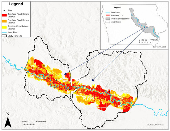 Iowa River Basin and study area. Study area consisted of the two-, five- and ten-year FRIs in the two study HUC-12s. River elevation in the study HUC-12s starts at 234 m and ends at 225 m above sea level. Floodplain elevation in the FRIs ranges from 225 to 237 m above sea level. Data from the Iowa Department of Natural Resources [35].