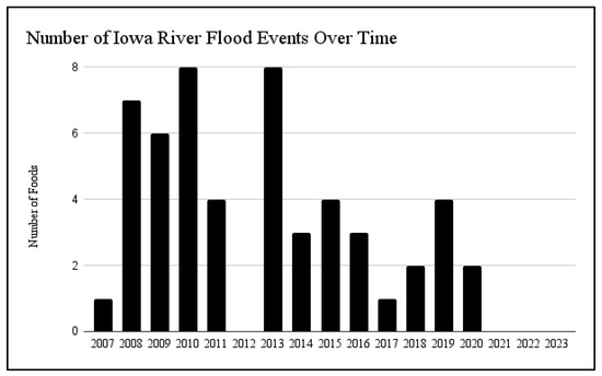 Number of Iowa River flood events over time near the study area. Data from the USGS National Water Dashboard [37].