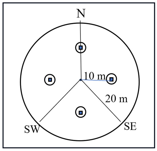 Coarse downed wood inventory was also taken along three transects in each plot running north, southeast, and southwest (Figure 3). Each log that was at least 7.6 cm wide and 0.9 m long was measured for center width and length [41,42]. The volume of each log was calculated by using the volume formula for cylindrical shapes: