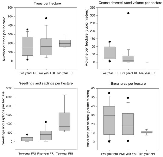 Forest inventory results from the two-, five-, and 10-year FRIs. Black dots indicate outliers.