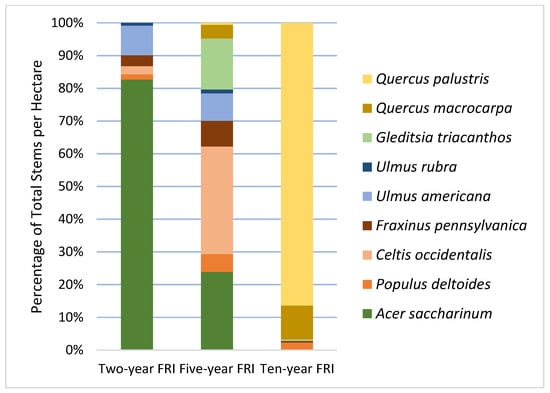 Species composition varied greatly between the FRIs (Figure 6). The two-year FRI comprised over 80 percent silver maple (Acer saccharinum), with the rest of the stems comprising just five other species: American elm (Ulmus americana), slippery elm (Ulmus rubra), hackberry (Celtis occidentalis), cottonwood (Populus deltoides), and green ash (Fraxinus pennsylvanica). The five-year FRI was the most diverse, with nine species present, including the aforementioned plus honeylocust (Gleditisia triacanthos), bur oak (Quercus macrocarpa), and pin oak (Quercus palustris). The 10-year FRI site comprised almost 90 percent pin oak and bur oak, with trace numbers of cottonwood, green ash, and honeylocust stems interspersed.