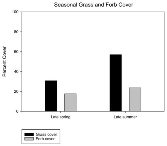 Seasonal vegetation cover across all sites increased from late spring to late summer, with forb cover increasing by 34 percent and grass cover increasing by 87 percent (Figure 7). In both seasons, grass percentages exceeded forb percentages; in late spring, there was, on average, 31 percent grass cover compared to 18 percent forb cover, and in late summer, those numbers increased to 57 and 24 percent, respectively.