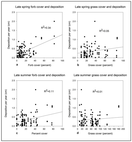 The relationships between deposition per year and summed grass and forb categories (Figure 8) were weak overall, with correlation coefficients not exceeding 0.58. In late spring, both categories of vegetation significantly correlated with annual deposition, with the most significant and strongest Pearson correlation between the two being the forb category (p < 0.001, r = 0.58) and the weakest correlation being the grass category (p = 0.03, r = 0.22). This is despite the fact that mean forb cover is around 42 percent lower than that of grass in late spring and 58 percent lower than that of grass in late summer (Figure 7). In late summer, only the forb category was significant, but its correlation coefficient was lower than in late spring (0.33 vs. 0.58), and its p-value was higher (0.001 vs. 9.92 × 10−10). This contrasts with the expanded results in Table 2, which show that short grass positively correlates with deposition in late summer.