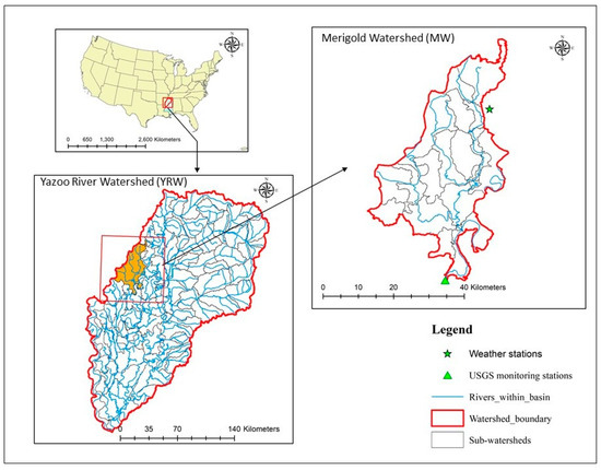 The geographical locations of the study area include Merigold and Yazoo River Watersheds showing USGS monitoring and weather stations.