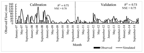 Correlating observed and simulated values allowed for the evaluation of the SWAT model’s performance. The sensitive factors that affect sediment, streamflow, TN, and TP loads must be changed as part of the calibration and validation process. The calibrated YRW model [65] was used to develop field-scale MW. The field-scale model was calibrated monthly using the data from the USGS streamflow monitoring station at Merigold, MS, in the Big Sunflower River, between 2007 and 2010 and validated between 2011 and 2014. Figure 2 illustrates that the model performance results for monthly streamflow simulations were good, with R2 values ranging from 0.73 to 0.75 and NSE values ranging from 0.70 to 0.75.