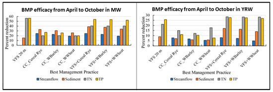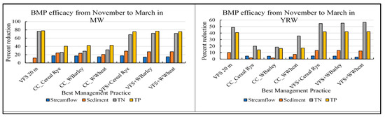 Between the dry and wet seasons of the year, a catchment’s hydrologic features change. Similarly, significant alterations in the movement of sediment and nutrients may occur. The results from BMP scenarios were evaluated between the primary farming season, which runs from April to October, and the post-harvest season, which runs from November to March. The wettest time of the year fell during the post-harvest season [9]. The implementation of VFSs, CCs, and a combination of VFSs and CCs were simulated as management scenarios for both the wet and dry seasons of the watershed. For MW and YRW in the case of VFSs, which has a width of 20 m, a substantial decrease in sediment and nutrient loads was seen during the wet season. Research from earlier studies suggests that a BMP’s effectiveness was higher in the field scale compared to the watershed scale implementation [34,46,83,84,85]. Sediment, TN, and TP loads for a 20 m VFS width decreased overall from November to March in the MW by approximately 12%, 77%, and 78%, respectively. Similarly, percentage decreases in the YRW were approximately 10%, 49%, and 41%, respectively. As for CCs, throughout the post-harvest period, there was a significant decline in TN and TP loads; Table 2 provides more information. In the case of the wet and dry seasons, respectively, Figure 3 and Figure 4 depict the comparative evaluation of BMP efficacies at the field and watershed scales.