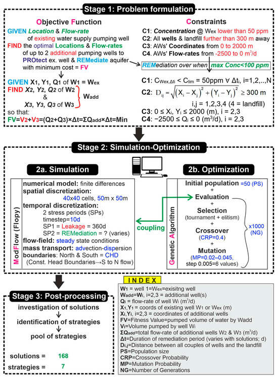 This paper deals with the optimal management of a theoretical polluted aquifer, specifically, the optimal remediation of a confined aquifer. The aquifer is assumed to have been polluted over a long period of time by unnoticed leakage in two sections of an underground pipeline conveying leachate from a landfill to a wastewater treatment plant. Upon delayed discovery of the extended pollution leak, it is decided to immediately shutdown the landfill’s drainage network operation. Simulation of the pollution’s spread is needed in order to predict the aquifer’s current state, and an optimal remediation strategy must be planned. Optimal remediation refers to the investigation of the optimal locations and flow rates of two additional pumping wells (AWs) to protect an existing freshwater supply pumping well. AWs should secure the water supply well’s fully operational mode throughout the remediation process at minimum cost. Optimization entails minimization of the operational cost of the AWs’ system; simply represented here by the total volume of water pumped by AWs. The protection of the existing supply well means that the pollutant concentration does not exceed a certain threshold. Another constraint derives from relevant rules in effect at certain regions of the Greek district, e.g., the Regional Unit of Chalkidiki, Prefecture of Macedonia; these dictate a minimum distance of any well to another or the landfill. The remediation process is assumed to be concluded when the maximum pollutant concentration of the study field drops below a certain threshold. The Modflow software [] simulates the flow field and advective–dispersive mass transport, while a simple binary elitist GA handles optimization, namely minimization of the pumped volume of water during the variable per solution remediation period. The coupled simulation–optimization (S–O) model, “Modflow-GA”, complemented by a sophisticated post-processing results analysis, produces optimal and alternate sub-optimal remediation strategies for the decision makers to select from. These strategies may feature pump-and-treat (PAT), hydraulic pollution control (HC), or a combination of the two remediation techniques. The methodology that is implemented in the current research is graphically presented step-by-step in Figure 1. Figure 1 should not be seen as a typical graphical abstract, as it is not a general summary of the methodology proposed, but a rather over-detailed delineation of the proposed process that the reader could fully comprehend only after reading through all the sections of this paper.