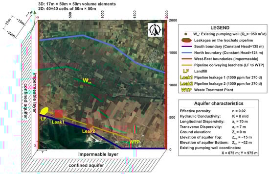 Theoretical study field including the top view of the aquifer and its layering and characteristics, the existing pumping well, the landfill, the pipeline conveying the leachate to the wastewater treatment plant, the leaks, and the boundaries.