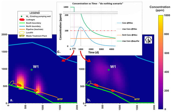 The prediction of the leaked pollution’s spread in the assumed current state (a year after the leaks’ initiation), simulated in a way presented in Section 2.2, is presented in Figure 3a (see Supplementary Material SM1 for the respective video of the full spread progression; SM0 is a list of all Supplementary Material Files together with a relevant description). If no countermeasures or remediation strategies are implemented, the pollution plumes will spread and pollute, and be at least partially pumped by, Wex. Assuming that the detection threshold for declaring a well polluted is CWex > 1 ppm, in the “do nothing scenario”, Wex is polluted approximately 240 d after the leaks’ discovery (see SM1). The maximum (max) pollutant concentration in the aquifer would be detected at approximately day 1000 (Figure 3b). The diagram in Figure 3c presents the temporal predicted evolution of pollutant concentration at Wex and the max aquifer concentration in the “do nothing” scenario.
