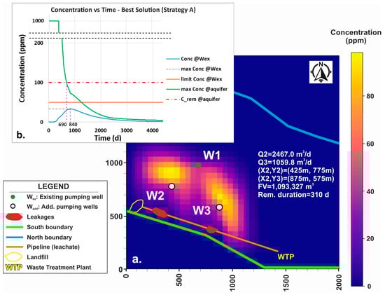 (a) Best solution of all runs (Strategy A); simulated concentration (C) map of the predicted day of max C at Wex (840d; simulation video as Supplementary Materials SM2). (b) CWex and max Caquifer vs. Time.