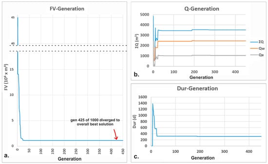 Supplementary Materials SM3 includes all raw result files of all six Modflow_GA applications concerning Runs 1–6 (three “.txt” files per run). Supplementary Materials SM4 presents the same results in an Excel file (sheets 1, 4, 7, 10, 13, and 16 for Runs 1, 2, 3, 4, 5, and 6, respectively), also including relevant FV-generations, ΣQ-generations, and Dur-generations graphs (sheets 2, 5, 8, 11, 14, and 17 for Runs 1, 2, 3, 4, 5, and 6, respectively). The respective graphs for Run 2 that produced the optimal solution are presented in Figure 6. SM4 also includes acceptable only solutions, namely solutions without penalties (sheets 3, 6, 9, 12, 15, and 18 for Runs 1, 2, 3, 4, 5, and 6, respectively).