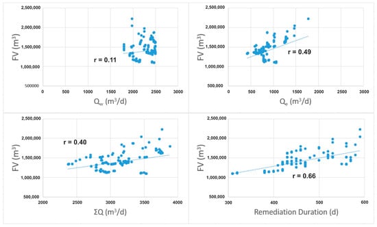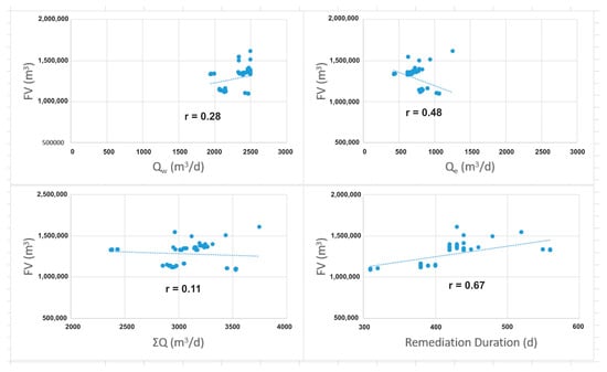 In order to investigate the impact of each decision variable (Xw, Yw, Xe, Ye, Qw, Qe) and total AWs’ flow-rate ΣQ, as well as the remediation duration Dur, the Pearson correlation coefficient (Cc) of each one against FV is calculated together with their standard statistics, median, mean, min, max, standard deviation (Table 3). This is calculated based on all acceptable solutions (Figure 8) and then based on the “best” solutions (Figure 9); these are assumed to be the solutions that exhibit FV < median FV.