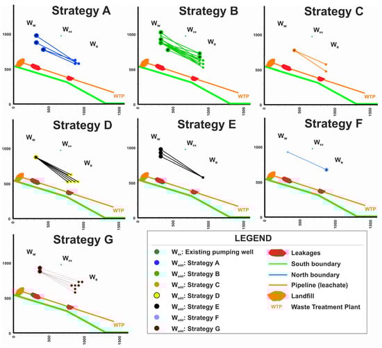 This process may vary from expert to expert and can be quite objective, but the final result of storing diverse solutions remains unchangeable and is the most important. The studied problem with the current configuration does not offer very diverse optimal solutions and, hence, strategies. The criteria for the strategy identification set here concern the size of the total AWs’ flow rate (ΣQ) and its distribution to the AWs (Qw/Qe), while the locations of the wells, given that they are not very different (see Figure 7), are considered to simply slightly alter the version of each general strategy.