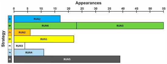 SM5 presents the results of the effort to identify strategies from the solutions that emerged from the series of runs. The 6 runs produced 168 identified different solutions, which are classified as variants of 7 polluted aquifer remediation strategies. SM5 sheet 1 presents the strategies of all 168 acceptable solutions per run, while sheet 2 presents all acceptable solutions stacked. SM5 sheet 3 presents all 168 acceptable solutions classified per strategy. Table 4 (and SM5, sheet 2) presents the best solution for each one of the 7 identified strategies. The best solution is actually the best of Run 2 and is classified as the best Strategy A version. Each solution in Table 4 corresponds to a video of the pollution mass spread (mass transport) and the remediation process’s temporal progression (Supplementary Materials SM2, SM6–SM11). Figure 10 presents the locations of AWs of all solutions that are presented in Figure 7 but classified per strategy. The radius of each well is proportional to its flow rate, while the coupled AWs per solution are connected with a line. Overall statistics per strategy are presented in Table 5, while the frequency of occurrence of each strategy and the run during which it appeared are graphically presented in Figure 11.