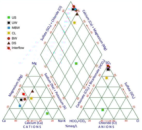 The DS soil, which, before the coal mine waste deposition, was similar to the US, has been under the influence of the coal mine waste pile for decades. This influence includes the transport of solid particles (with size from clay to gravel), especially during overland flow in the BCW and MBW hydropedological zones, as well as dissolved chemical components from interflow through the deepest part of the burned waste pile in an acidic environment. The hydrogeochemical signature of this influence includes higher contents of SO42−, Ca2+, Mg2+, Al, Mn, Ni, Cu, and Zn than the US soil.