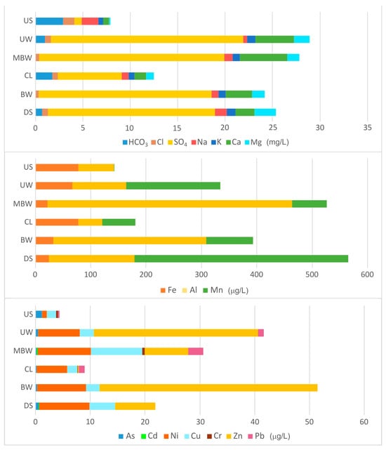 Regarding major ion content, US and CL leachates show much lower mineralisation than the UCW, BW, MBW, and DS leachates, which is consistent with the EC results. The hydrogeochemical facies of leachates are Na-HCO3 and Mg-SO4 for US and CL, respectively, Ca-SO4 in the case of UCW, BW, and MBW, and Mg-Ca-SO4 in the case of DS. The BW10 leachate features are analogous to BW, except for the lower SO4 content.