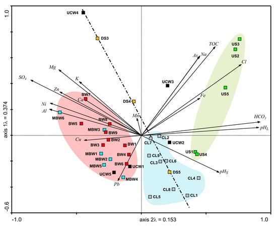 The pH values are higher in samples without coal mining influence, specifically, 5.7 in US and 5.0 in CL. In the case of the samples with coal mining influence, pH values are more acidic, especially in materials with self-burning: 4.2 in BW and 4.1 in MBW. Soil electrical conductivity also reflects the coal mining influence since the lower values were measured in the US and CL samples (11 µS/cm and 22 µS/cm, respectively). In comparison, the higher values were measured in UCW, BW, and MBW (67 µS/cm, 58 µS/cm, and 65 µS/cm, respectively). In the DS samples, intermediate pH and EC values were measured. The TOC in leachates is higher in soils with humified organic matter, particularly in the US soil, but also in the BCW soil, the BW layer of the BCW soil, and the DS soil.