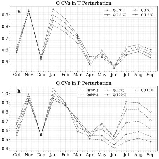 Monthly coefficients of variation under various temperature (a) and precipitation (b) perturbations.