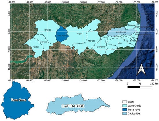 In this study, we selected two basins for analysis. The first, Capibaribe, is a wetland basin that covers part of the capital, Recife. The Capibaribe basin has an area of 7536.65 km2. The second, Terra Nova, has 4909.09 km2, is a semi-arid basin that receives water from the São Francisco River through the PISF-São Francisco Integration Project, Figure 1. Hence, these two basins were chosen to be presented here.