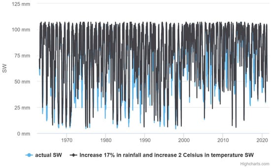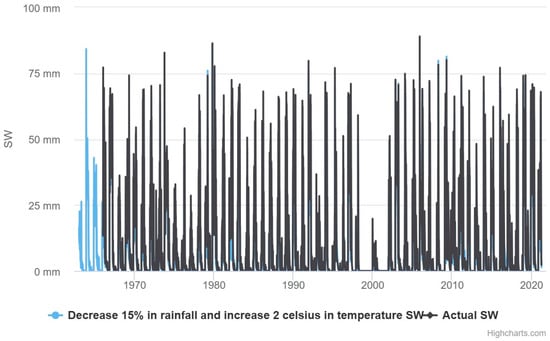 Climate change is already happening at the local scale. Climate change will increase soil water even more in the future—Figure 4. Soil water will be further impacted in the future. Consequences: increased likelihood of landslides. Using the humidity data, it is possible to predict landslide alerts due to the high humidity content like, for example, in 1975—Figure 5. The capital of Pernambuco has faced two major floods in the last half century: the first in 1966 and the second, and more significant, in July 1975. Between 17 and 18 July 1975, streams and the Capibaribe River rose rapidly and overflowed, flooding entire neighborhoods. About 80% of the city of Recife was underwater. Greater attention during these periods will save lives, more so than only using weather forecasts.
