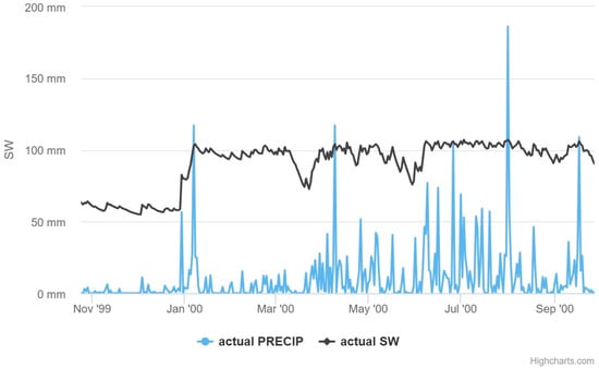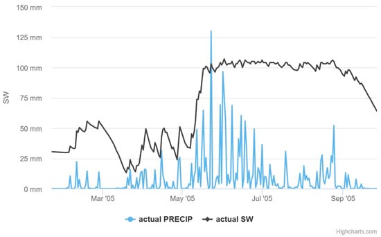 Between 30 May and 2 June 2005, heavy rains caused flooding in 25 areas of the Agreste, Zona da Mata, and Littoral of Pernambuco, leaving 36 dead and more than 30,000 people homeless. About seven thousand houses were partially or completely destroyed; 40 bridges were damaged; and 11 state highways were hit, seven of which were closed. The water flooded several cities’ central streets, hospitals, schools, and commercial houses, causing enormous material damage. In this period, the SW is shown in Figure 7. Yet, soil water (SW) and precipitation can cause separate flooding risks and landslides.