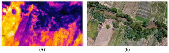 Aerial photographs obtained using Unmanned Aerial Vehicles (UAVs) of a small area of the Terra Nova watershed. (A) Surface temperature image. (B) RGB—Red, Green, Blue image.