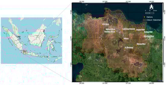 The studied area was the Citarum watershed, covering an area of 6600 km2 with a 5.5-billion-cubic-meter average annual flow volume, and 2353-mm annual rainfall, 80% of which falls from November to May (Figure 1). The Citarum River is the main river in the Citarum watershed that is utilized for various purposes; it is not only used by 7 districts and 2 cities in West Java but also as a source of raw water for drinking water in the Capital City of Jakarta. The Citarum River and other rivers in northern West Java, such as the Ciherang, Cilamaya, Cijengkol, Ciasem, Cigadung, Cipunegara, and Cilalanang Rivers, form an integrated hydrological area with a hydrological unit of 1.10 million ha. The Citarum watershed is the main catchment area of the Saguling Dam, and the Jatiluhur Dam supplies approximately 7650 million cubic meters of water per year (m3 a−1). Since 2012, approximately 78% of the extracted water has been used for irrigation, 14% for industrial and electricity generation activities, and 8% for domestic consumption []. This watershed is affected by the monsoon system, which changes its direction twice a year. The average river discharge in the wet season shows an increasing trend, while the average river discharge in the dry season shows a decreasing trend.