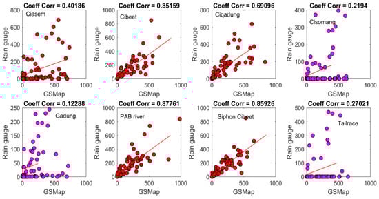 The high correlation between the GSMaP and the rain gauge occurred in the Ciasem River, the Cibeet Weir, the PAB River, Siphon Cibeet, and the Cigadung River. The correlation between the GSMaP and the rain gauge is relatively high in Indonesia in the rainy season [,]. The GSMaP data were also entirely accurate when we used them to observe the amount of rainfall leading to any flooding events in Jakarta, a lowland area around the Citarum watershed []. In another study, a researcher revealed that the GSMaP accuracy of its valuation using a gauge-based rainfall measurement crossing the Poyang Lake Basin showed that the coefficient of the monthly correlation was 0.85. So, it indicated a significant linear relationship between the product estimates and the measured rainfall observations [].