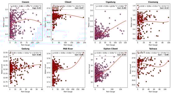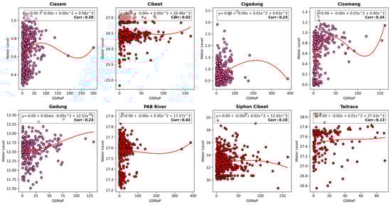 Figure 4 and Figure 5 depict the relationship between GSMap rainfall and water level, as well as rain gauge data and water level. The correlation analysis was conducted using a 3rd-order polynomial correlation; however, the resulting correlation coefficient remains small. This can be attributed to the inherent differences between rainfall, which is a discrete variable, and water level, which is a continuous variable. Furthermore, it is important to consider that hydrological systems are influenced by various factors, such as drainage, evapotranspiration, topography, local climate, and water management (including the presence of dams). These factors can affect how rainfall contributes to rising water levels [,].