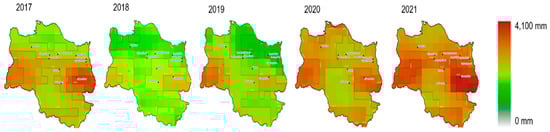 The Citarum watershed generally has an average annual rainfall of between 1200 mm in coastal areas (the northern part of the watershed area) and 4000 mm in areas dominated by hills and mountains (central to the southern part of the watershed area). Nearly 70% of the annual rainfall occurs during the rainy season (September to November). Monsoons mainly influence seasonal rainfall distribution, and the southern mountain’s orographic effect dominates the rainfall. From the analysis of the annual isohyet data of the Citarum watershed between 2017 and 2021 (see Figure 6), the areas with the highest annual average values occur in the western and eastern side areas with a value of 4000 mm/year. A minimum value of 1200 mm and a maximum value of 2700 mm/year occurred in 2018. The average annual rainfall in the regions in terms of their topographical sequence from the upstream to the downstream was as follows: the Cisomang River (2838 mm/year), the Ciasem River (3354 mm/year), the Tailrace (2543 mm/year), the Cigadung River (2716 mm/year), the Gadung Weir (2537 mm/year), the Cibeet Weir (2447 mm/year), the Jengkol Weir (2512 mm/year), Siphon Cibeet (2444 mm/year), the Leuweung Weir (2457 mm/year), and the PAB River (2486 mm/year). Considering this information, we found out that areas near a mountain had higher rainfall than the lowlands located in a coastal area. That condition was still natural since the dynamics of the climate and the weather in the Citarum watershed were dominated by a local process, such as a land–sea breeze; as a result, the rain clouds tended to be near a mountain. However, this condition might change due to the increasing rainfall intensity. Based on the water balance simulation of some climate change projections in some tropical areas, such as the Batang Hari Watershed in Sumatra, climate change causes increased flooding events more frequently []. Moreover, Priyambodo et al., 2021 [] also observed the frequent occurrence of flooding for the past two decades in the lowlands around the Citarum watershed.