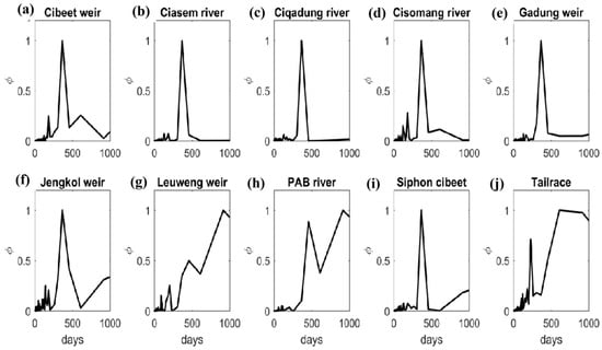 Rainfall data are an essential factor affecting groundwater and surface water (water level) [,]. The spectrum of water level variability is depicted in Figure 7. In general, the variability of water tables from rivers and weirs in the Citarum watershed followed the monsoon patterns, except in some places serving as the control, such as those at the PAB River. The water level variability measured in Tailrace DAM Jatiluhur had the same pattern as the dam discharge. The maximum spectrum generally occurred in approximately a 360-day period, which was the same duration as the monsoon period. Only two stations, the Leuweung Weir and the Tailrace stations, did not have a spectrum peak in the monsoon period. At the stations with a dominant monsoon spectrum, the spectrum with a shorter-than-200-day period was also significant. We thought this situation occurred due to a fairly dominant oscillation system in Indonesia, such as the Madden–Jullian Oscillation (MJO). We applied a low-pass filter with a 50-day cutoff frequency since this condition represented the effects of the MJO and the Monsoon [,]. We assumed that the high-pass filter represented the fluctuating conditions due to various anthropogenic effects. On the other hand, the high-pass filter pattern had a significant amplitude (the graph was not shown). It showed that daily variability such as an anthropogenic manifestation could not be ignored.