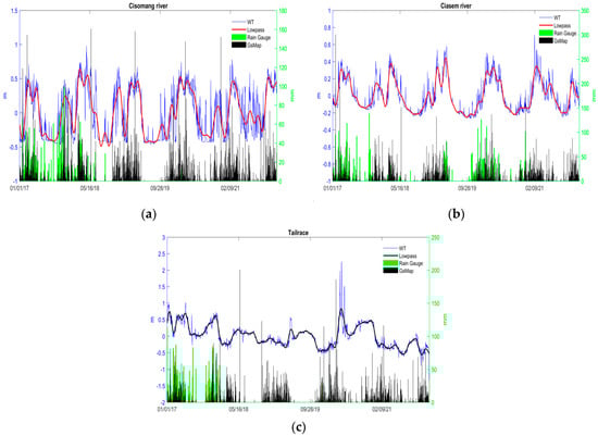 (a) A low-pass filter of water level and rainfall was obtained from a rain gauge instrument and GSMaP data at Cisomang River, (b) a low-pass filter of water level and rainfall obtained from a rain gauge instrument and GSMaP data at Ciasem River, and (c) a low-pass filter of water level and rainfall was obtained from a rain gauge instrument and GSMaP data at Tailrace.