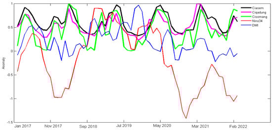 In this study, the spatial rainfall data used are GSMaP_NRT (near real-time) from 1 January 2017 to 7 February 2022, in the Citarum watershed (6.25° S, 106.95° E to 6.65° S, 107.85° E). The GSMaP_NRT data of the rainfall are a GSMaP product applying a Kalman filter algorithm [], with a domain coverage extending from 60° N to 60° S. It can be downloaded at https://sharaku.eorc.jaxa.jp/GSMaP/, accessed on 17 May 2024. The grid selected on the GSMaP_NRT data was defined by adjusting the location of the SESAME rain gauge station with a ±-0.05-degree latitude/longitude position (≈5 km) from the grid’s coordinate (Table 1). Nino 3.4. data are available from NOAA (https://www.cpc.ncep.noaa.gov/data/indices/, accessed on 17 May 2024) and DMI data are available from https://stateoftheocean.osmc.noaa.gov/sur/ind/dmi.php, accessed on 17 May 2024.