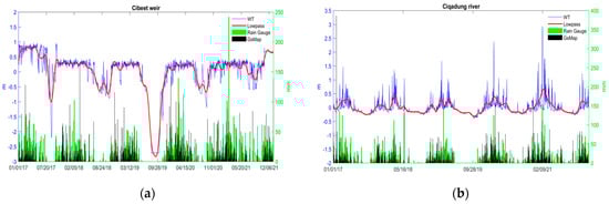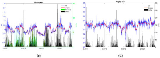 (a) A low-pass filter of water level and rainfall was obtained from a rain gauge instrument and GSMaP data in Cibeet Weir, (b) a low-pass filter of water level and rainfall was obtained from the rain gauge instrument and GSMaP data at Cigadung River, (c) a low-pass filter of water level and rainfall was obtained from a rain gauge instrument and GSMaP data at Gadung Weir, and (d) a low-pass filter of water level and rainfall was obtained from GSMaP data at Jengkol Weir.
