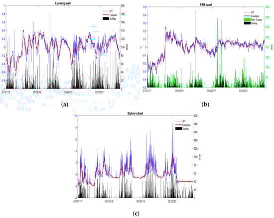 (a) A low-pass filter of water level and rainfall was obtained from GSMaP data at Leuweung Weir, (b) a low-pass filter of water level and rainfall was obtained from a rain gauge instrument and GSMaP data at PAB River, and (c) a low-pass filter of water level and rainfall was obtained from GSMaP data at Siphon Cibeet.