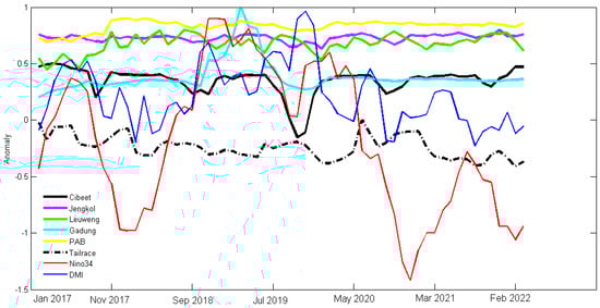 The anomaly in the Ciasem River followed the monsoon pattern where the water level would rise in the rainy season until the transitional season took place from January to May (Figure 8b). The anomaly in the low-pass filter increased before the water level rose and after the water level dropped. The monsoonal pattern was unclear for the Tailrace and Jatiluhur Dam stations (Figure 8c). High fluctuations occurred in the 2020 dry season. To examine the influences of El Niño and the Indian Ocean Dipole (IOD), we computed monthly averages of water levels based on the Nino index (Nino 3.4.) and the Indian Ocean Dipole index (DMI) dataset. Subsequently, we standardized the water level data to facilitate comparison with Nino 3.4. and DMI. In the upstream region, variations in water levels amenable to comparison with Nino 3.4. and DMI are primarily observed in the Ciasem and Cisomang Rivers, while in the downstream region, such variations are predominantly found in the Ciqadung River (refer to Figure 9). It is worth noting that water level data from sources other than these three rivers, such as weirs, dams, and artificial rivers, exhibit relatively constant levels due to regulatory interventions, thus deviating from natural variability.