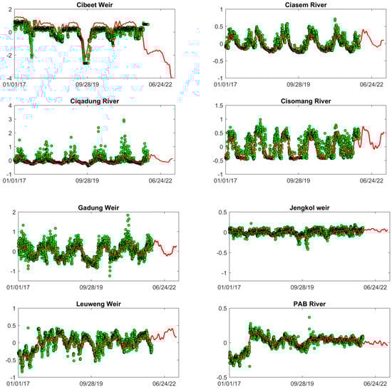 The correlation between the models and the observations had an R-squared value of over 50%. The Cibeet Weir had an 88% correlation between the model and the prediction, indicating that the water level was likely to decrease. Meanwhile, the Ciasem River had a 91% correlation, showing a monsoon pattern, a rising water level in the rainy season, and a decreasing water level in the dry season. The same case occurred at the Cigadung River in that the forecasting showed the same patterns as the measurements when the correlation was 80%. The predicted water level behavior at the Cisomang River generally had the same pattern as that of the measurement data, with an 83% R-squared value. The Gadung Weir had an 81% correlation with a monsoonal water level pattern in the future. It was predicted that the water level in the Leuweung Weir, which had an 89% correlation, would increase in the future, while it was predicted that the water level of the PAB River, which had a 97% correlation, would remain constant. Moreover, in the Tailrace, which had a 58% confidence level, it was predicted that the water level would tend to decrease.