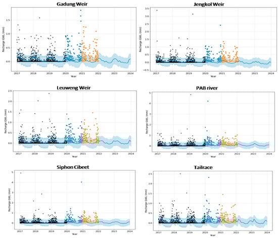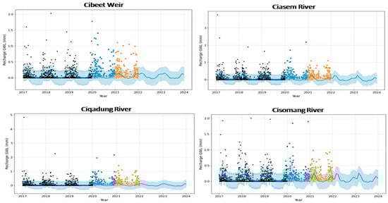 In this study, we estimated the water resources by calculating the recharge GWL estimated from the rainfall. The latest study conducted by Suryanta et al., 2022 [] shows that the absorption capacity of rainwater in the Citarum watershed has a high and very high dominance, so recharge calculations with rainfall are acceptable. Figure 14 depicts the results and the forecasting.