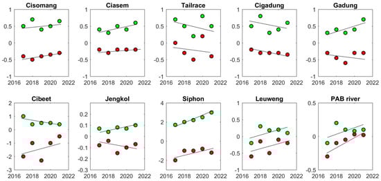 The water level in the upstream areas, such as the Cisomang River and Ciasem River, tended to rise in the rainy and the dry seasons, but in the Tailrace (the Jatiluhur Dam), as well as in the Cigadung River, the water level had a downward trend in both of the seasons (see Figure 15). In general, for the low-lying areas, the water level tended to rise in the rainy season and tended to decrease in the dry season, except for the water level in areas near an urban area such as Siphon, Leuweung, and PAB, which tended to rise in both of the seasons. In these stations, especially the PAB River, the water obtained from the Jatiluhur reservoir, channeled to Jakarta for water drinking, was close to an urban area. This increasing water level was probably due to the increasing demand for water in Jakarta (PJT2 2020). The conditions from 2017 to 2019 were normal, while the La Nina phase occurred in 2020 and 2021, resulting in intense rainfall in the Citarum watershed, thus increasing the water level. Several studies on the projections of climate change in various watersheds revealed that it affected them in that more frequent droughts and floods were marked by an increase in temperature and precipitation []. The water level in the Jatiluhur reservoir (Tailrace) tended to decrease, indicating that the Citarum watershed was vulnerable to climate change. The most vulnerable areas were those in the lowlands, for they indicated a downward trend in the water level.