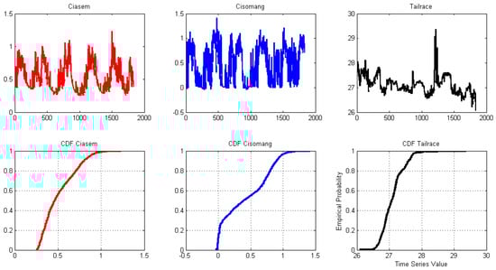 Cumulative distribution function (CDF) of water level at upstream region. Upper section is the water level, the lower section is the CDF. Red color is the Ciasem river, blue color is the Cisomang river and the black colour is the Tailrace.