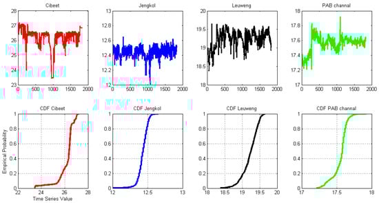 Cumulative distribution function (CDF) of water level at downstream region. Upper section is the water level, the lower section is the CDF. Red colour is the Cibeet Weir, Blue color is the Jengkol Weir, Black colour is the Leuweung Weir and Green colour is the PAB channal.