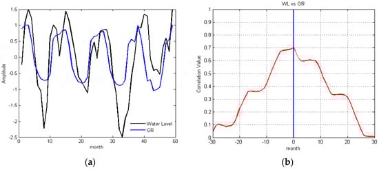 With so many rivers in the Citarum watershed, the groundwater divides become complex, so discussing them one by one takes a lot of time. Instead, to obtain a general picture, we look at the behavior of the water table and GR relations for the average Citarum watershed area. We have shown above that the water level and GR have a similar pattern and time lag several months between the peak of the water level and GR (see Figure 18a). The cross-correlation between the water level and GR occurs around 0.7 for water level vs. GR. It is depicted in Figure 18b. For a rough approach, the water table and GR have an empirical relationship GR = 0.21 × WL − 2.7, which shows that the relationship between the water level and GR is linear. Of course, this is a very rough approach due to the fact that we only use about three years of data and a monthly average.